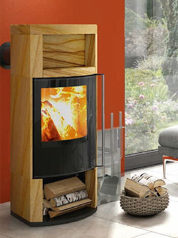Ein moderner Ofen mit traditioneller Verkleidung. Stahlkorpus mit Speckstein- oder Sandsteinverkleidung, die Türe komplett aus Glas schwarz bedruckt, seitlich eine elegante Reling als Griff. Das Gewicht der Steinverkleidungen dient zusätzlich zur Optik als Speicherung.