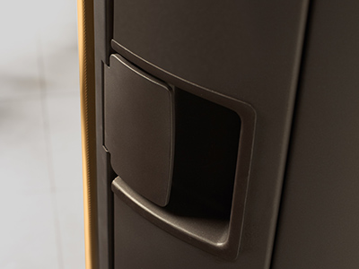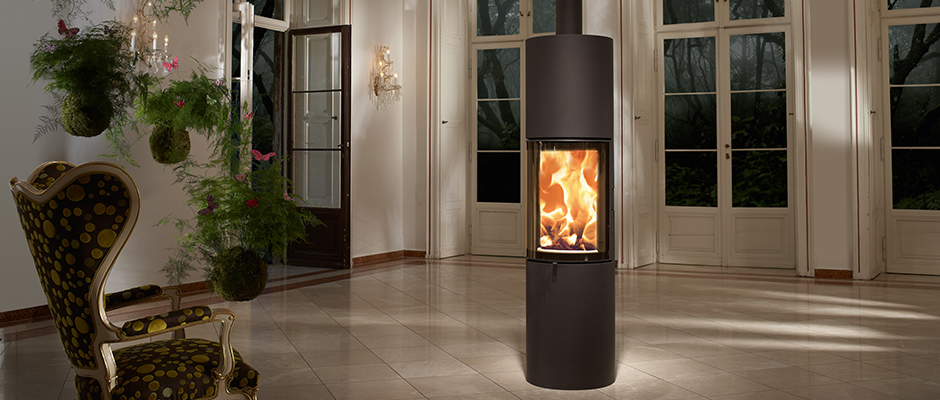 Ein eleganter hoher und schlanker Kaminofen. Seine große, fast 180° gerundete Scheibe lässt viel Feuersicht zu, auch von der Seite. Der Griff ist seitlich in eine Mulde im Korpus eingebettet. Mit fast 1,70 m Länge bringt er die Feuerung auf eine angenehme Höhe.